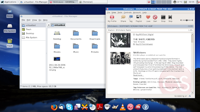 VirtualBSD also comes with a good selection of software which truly makes it fully functional 'out of the box', as claimed. Miro and VLC are included and I was able to download a few movie trailers from within Miro and watch them, watch Flash videos on Youtube and a news site and downloaded an mp4 stream which I was then able to play in VLC, in full-screen and resizing effortlessly. A plugin for Firefox 3.6, which has the Mozilla Prism extension to create small web applications and a a few handy bookmarks to services like Evernote and SimplyBookmarks, is not installed. The VM comes fully equipped with Thunderbird, OpenOffice, Transmission, Samba and the printing service Cups. These alone pretty much resemble the selection any Xfce based Linux distribution like Salix would give you or my own custom Slackware, but going trough the menu shows there's also much more installed like the Gnutella peer-to-peer client, Skype and a Lastfm client with which I was able to stream mp3's.