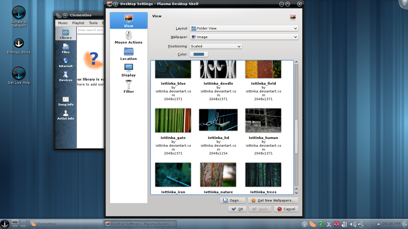 The desktop packs a fair selection of KDE themes and several additional window borders on top of old style goodies like Plastik, and several colors of the Oxygen cursor themes. There's also an option pre-installed to tie in Gtk theme settings. Wallpaper selection is again as painful as it was in the GNOME version. You get the wallpapers there plus many that come with the K environment, and here sadly only very few of the better ones. At least we know a good chunk is taken up with rubbish wallpapers and games.