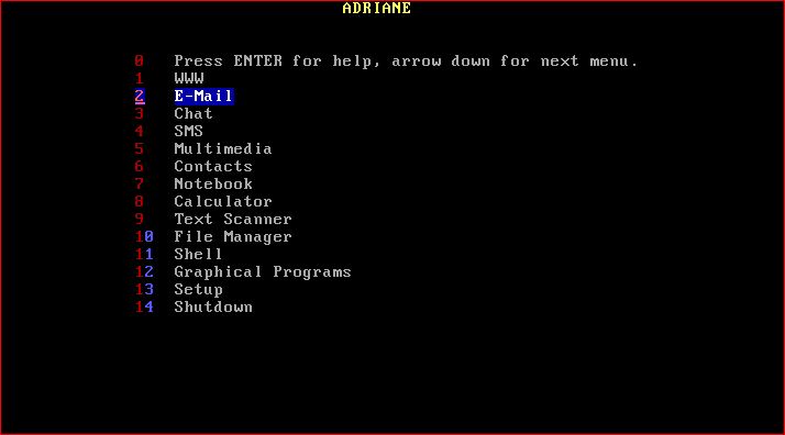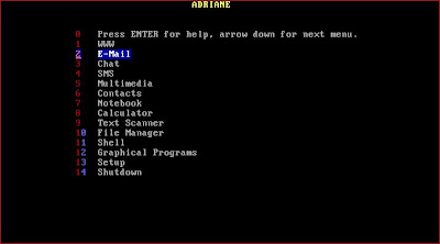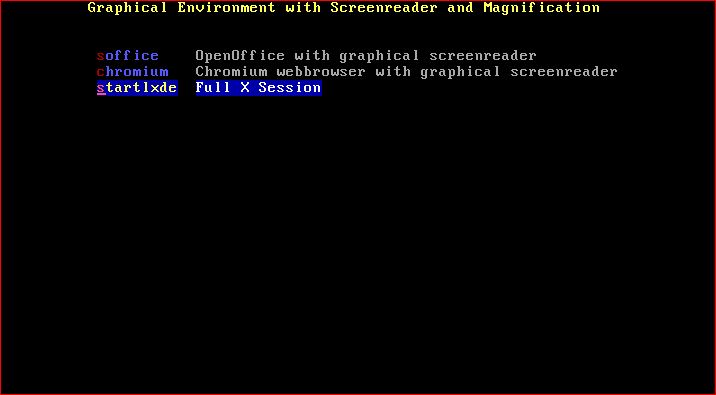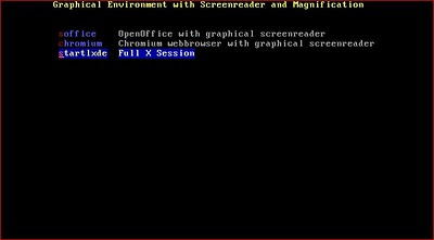 Finally, you can also get access to graphical programs from within the menu, where you can choose from starting LibreOffice with ORCA screen reader (here still identifying as soffice/openoffice, that's how old the entry is) which launches the office suite in full screen, starting the Chromium browser with screenreader or starting the LXDE desktop with screenreader enabled. This is the part where you get the cool "Initiating startup sequence" message spoken by a soft female voice that's been part of Knoppix forever. Sort of makes you feel like on your very own personal space odyssey. Exiting one will bring you back to the main "Adriane" menu.