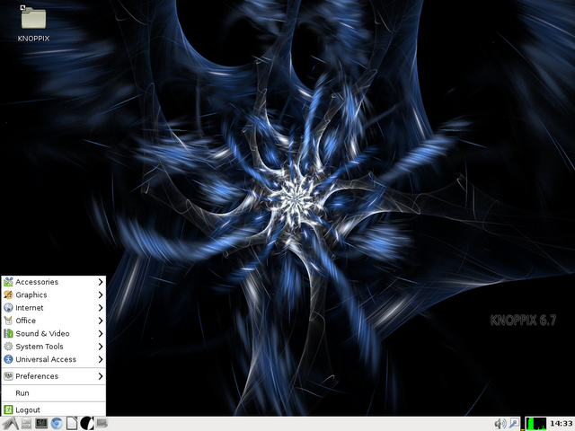 Knoppix isn't the most beautiful distribution. Actually, that's an understatement, but it's not what it's concerned about and never was. In fact the wallpaper is the only nod to visual appearance and style. It is still an utterly utilitarian distribution with many qualities, including tools to aid accessibility for visually impaired or otherwise disabled users, network and system administration, and rescue and repair tasks. In contrast to earlier versions KDE 4 applications are now notably absent from the CD, and where an earlier 6.0 that was built on Debian 5 "Lenny" still excelled at multimedia, Broadcom wireless and Compiz the current 6.7 is based on Debian 6 "Squeeze", which has taken a different stance on firmware inclusion. It seems Knoppix has followed this to a certain extent and some functionality has regressed in order to keep up with Debian philosophy. Adobe Flash for example used to be part of the default.