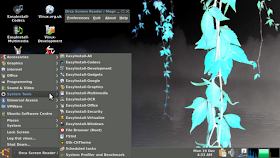 There's a lot of normal user software here, like Thunderbird and Gwibber, a client for Twitter, but no office suite or word processor. However under System Tools you'll find plenty of EasyInstall links for all sorts of software, including office and OCR character recognition software. Some of these links that are obviously deemed more important are also on the desktop, to install multimedia, codecs and office applications. You'll also find a shortcut to the Quickstart guide that opens in the browser from local hard drive, no internet access required. A long text file details keyboard shortcuts, so that users can theoretically move around the desktop with only the keyboard and audio feedback. Compiz is pre-installed which contributes its own screen magnifying glass.