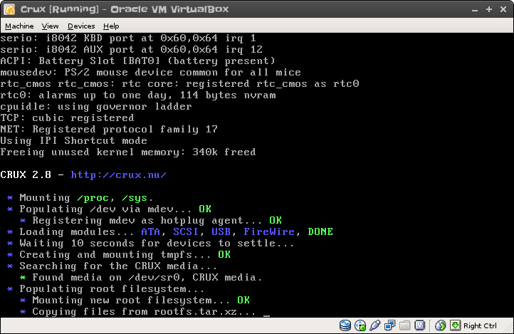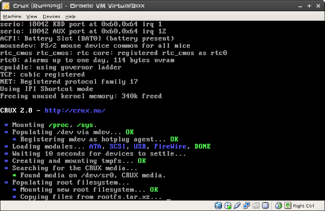 CRUX 2.8 was released 24/10/2012, and as ever the official build is i686 32-bit only, but the download page also offers contributed images for the x86_64 architecture. Release notes for RC1 of the already upcoming 3.0 suggest x86_64 will be an official build from now on, or the distribution will switch its main supported architecture. Both have been processed with isohybrid and can be extracted for booting from a USB drive or Flash key etc. Other architectures like ARM, PowerPC and Sparc64 are unofficially supported. I went with the official build for maximum compatibility for which the iso file is 266.3 MB in size. Not a lot, it downloads at a good rate in mere minutes, with many local mirrors accessible from the main page. Of course you'll only get a basic system for that which comprises the install base and the ports tree. It's up to the user to shape the system and that means it can be anything you like. I noticed that on Distrowatch CRUX is classed as server, but, being a vanilla distribution, it can be anything you build, from server to desktop. Follow me to see what it's like.
