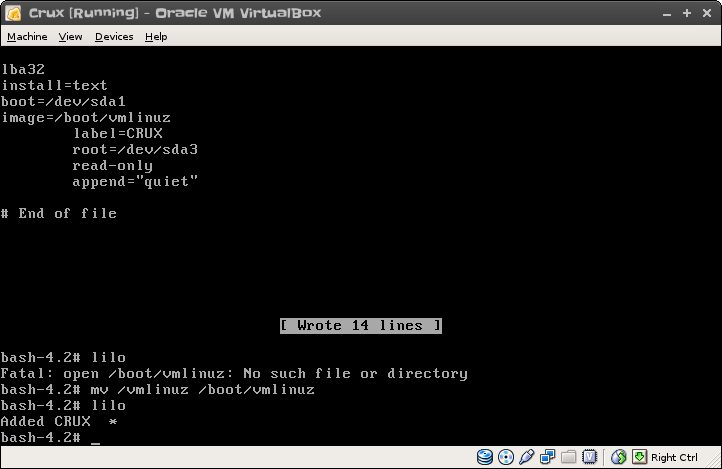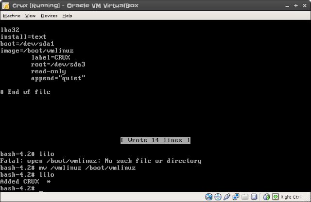 I won't go into configuring the kernel here, but readers could check out my post on this subject earlier in the year, or one of these two posts on kernelnewbies.org or one of the many other guides. The CRUX handbook also outlines the basic steps which is probably all you'll need if you've done this before and just need a reminder what to type, but it won't tell you what to select in the configuration steps and which modules and settings your hardware requires to run effectively, so I'ld recommend you know your machine in and out before attempting this. By default the CRUX kernel configuration is extremely slim, in line with the basic and light approach taken, and a default compile results in a kernel of only 1.2 MB. It won't make use of your TV card though.
