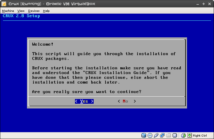 Once finished we are autologged in to the root account. Type 'setup' to proceed and we get a nice little welcome screen which reminds to take a look at the CRUX installation guide before we continue. If you haven't, you really should look at the relevant sections in the handbook. The script will then guide through the rest of the routine, and all in all the steps are very similar to installing Arch.