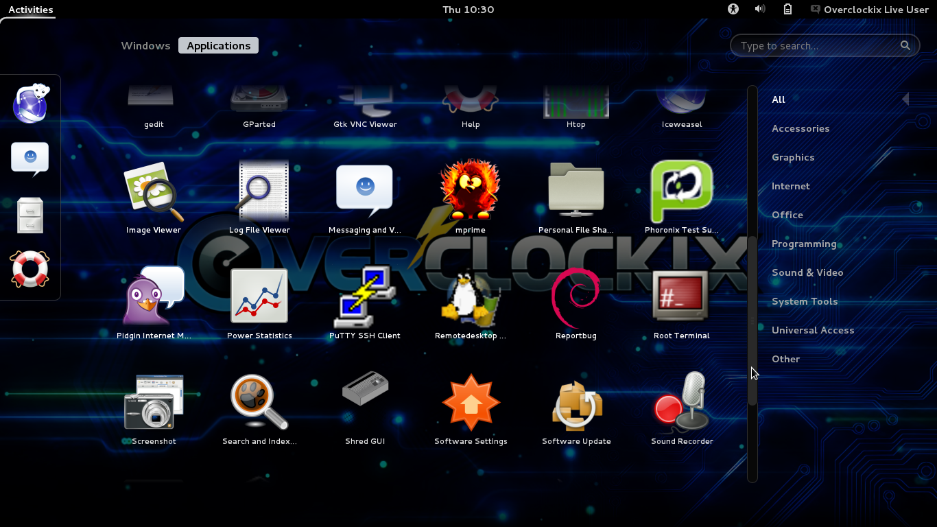 There are a couple of tools included here like system profiler for hardware detection and to list sensors and the like, power statistics, Putty SSH and a remote desktop viewer and the BOINC distributed service manager, a tradition carried over from the old distro days. However, the real heart of the distributions seems to be the inclusion of the Phoronix test suite and I believe some overclocking utilities for graphics cards. Overclockix performed well on my measly testing laptop with an AMD dual-core E-350 at 1.6 GHz, an AMD Radeon HD 6310 and three Gigs of memory and the Shell was responsive overall, with a slight delay in the beginning and when launching the Applications overlay. It was utterly fast running on my Acer AMD Phenom II X3 with 2.1 GHz and a ATI Mobility Radeon HD 4250. Unfortunately the network was not accessible. Trying to start it resulted in the error that "system network services are not compatible with this version" on both laptops.