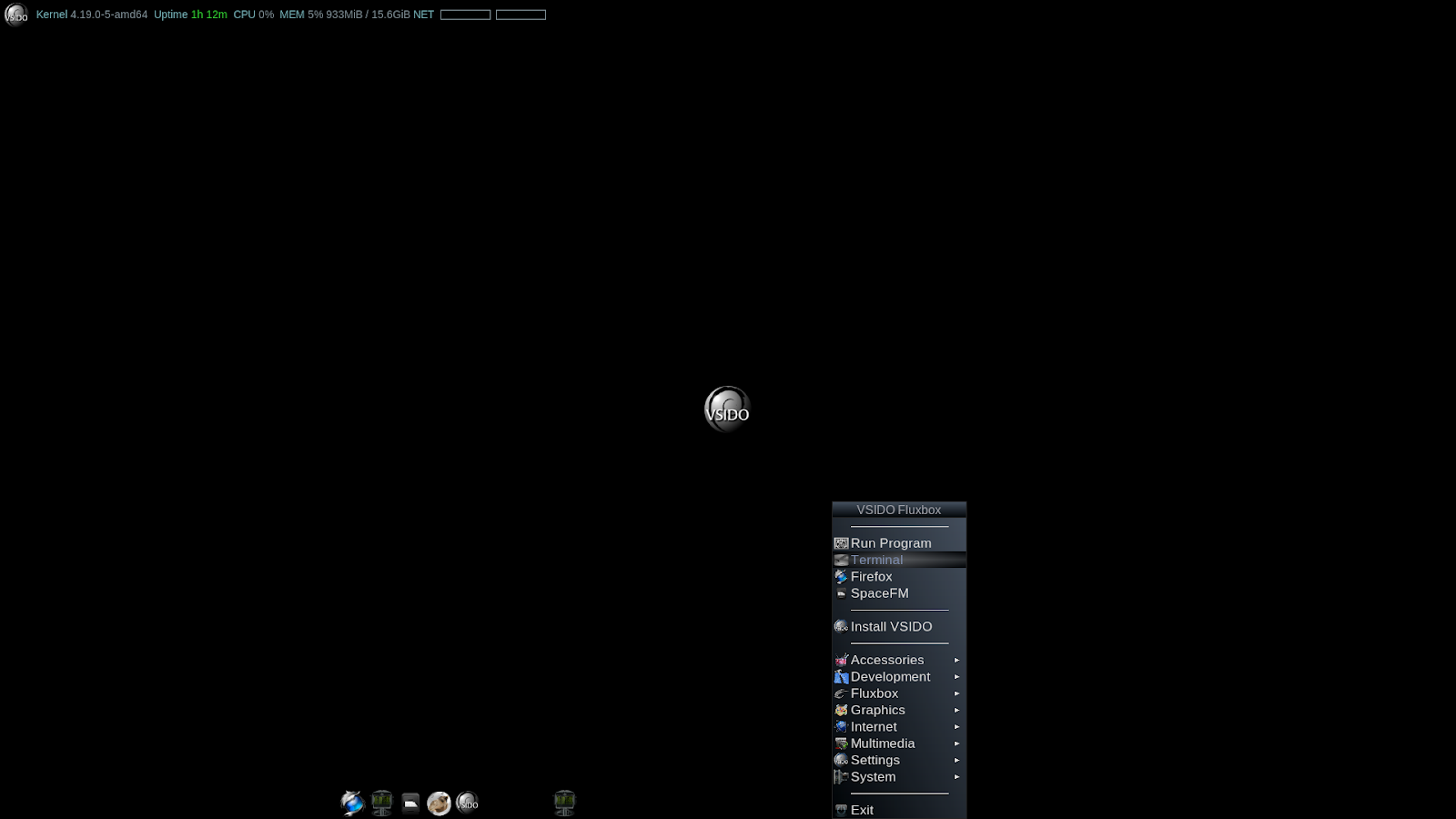 We get a conky one liner at the top providing basic system information in terms of running kernel, uptime, CPU and memory usage and an indicator for net activity. The wallpaper shows off the Vsido logo. At the bottom is a dock with starters for the Firefox browser, the Xfce4 terminal, the file manager (SpaceFM), gMusicbrowser and the Fluxbox menu, which can also be launched with a right click on the desktop and has a smokey transparency to it.