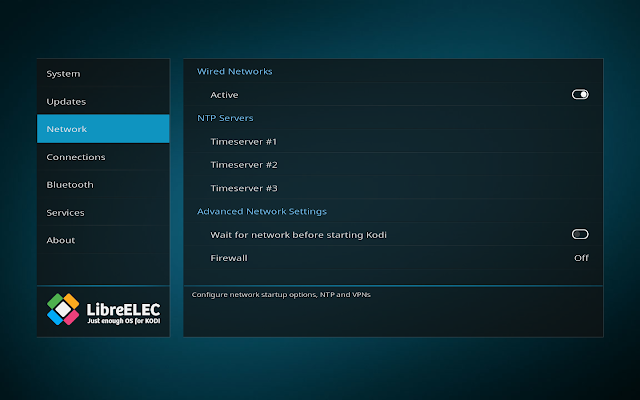 The main screen has a LibreELEC entry added where the above as well as time servers, Bluetooth, updates and keyboard type and layout can be reconfigured. We can set a PIN code and enable the firewall for more security. This is as close to a configuration panel for non-Kodi related operating system settings as it gets here. It can also be accessed from the Add-ons section.
