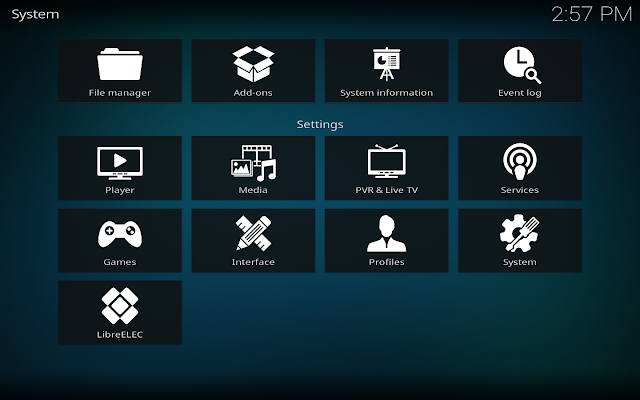 The system is booting straight into the media center which is, being a stripped-down specialist distribution built for a single purpose, the only graphical interface it comes with and exactly what we want. So far so good. A few things are different from a stock Kodi install.