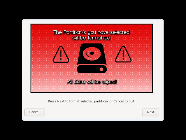 If you go straight for the install option in the menu copying the image to drive takes less than two minutes. There's even a very welcome warning that this will now wipe your partitions.  Not all distributions do that in this day and age. This being a empty virtual disk I took the convenient route and let it take over the entire drive. After this we are prompted to install the Grub2 boot loader.
